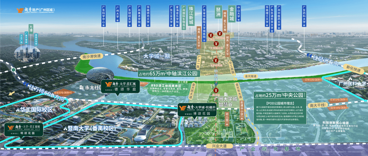 琶洲旁·和樾系·低密公园改善住区,南大干线一路万博,地铁4站琶洲(新造-万胜围),5站金融城(新造-车陂南),下楼即享占地约90万㎡公园(数据来源:广州市珠江后航道(广州国际科技创新城段)公共空间设计方案,占地约25万m²中央公园(首期已开放)+占地约65万m²滨江中轴公园(规划中)),九年一贯制中小学已签约广附番实(最终的学校名称、招生条件和招生范围以教育部门公布为准)。