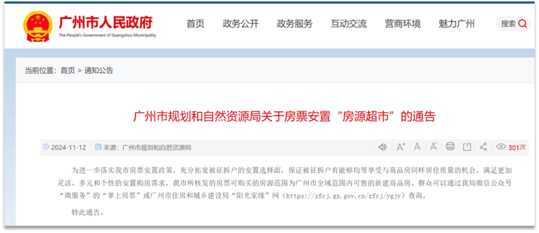 而在去年11月12日,广州自然资源局发布了关于房票安置“房源超市”的通告,明确广州市发放的房票可购买房源为广州市全范围内可售的新建商品房,且公布微信公众号及住建局网站等选房方式。