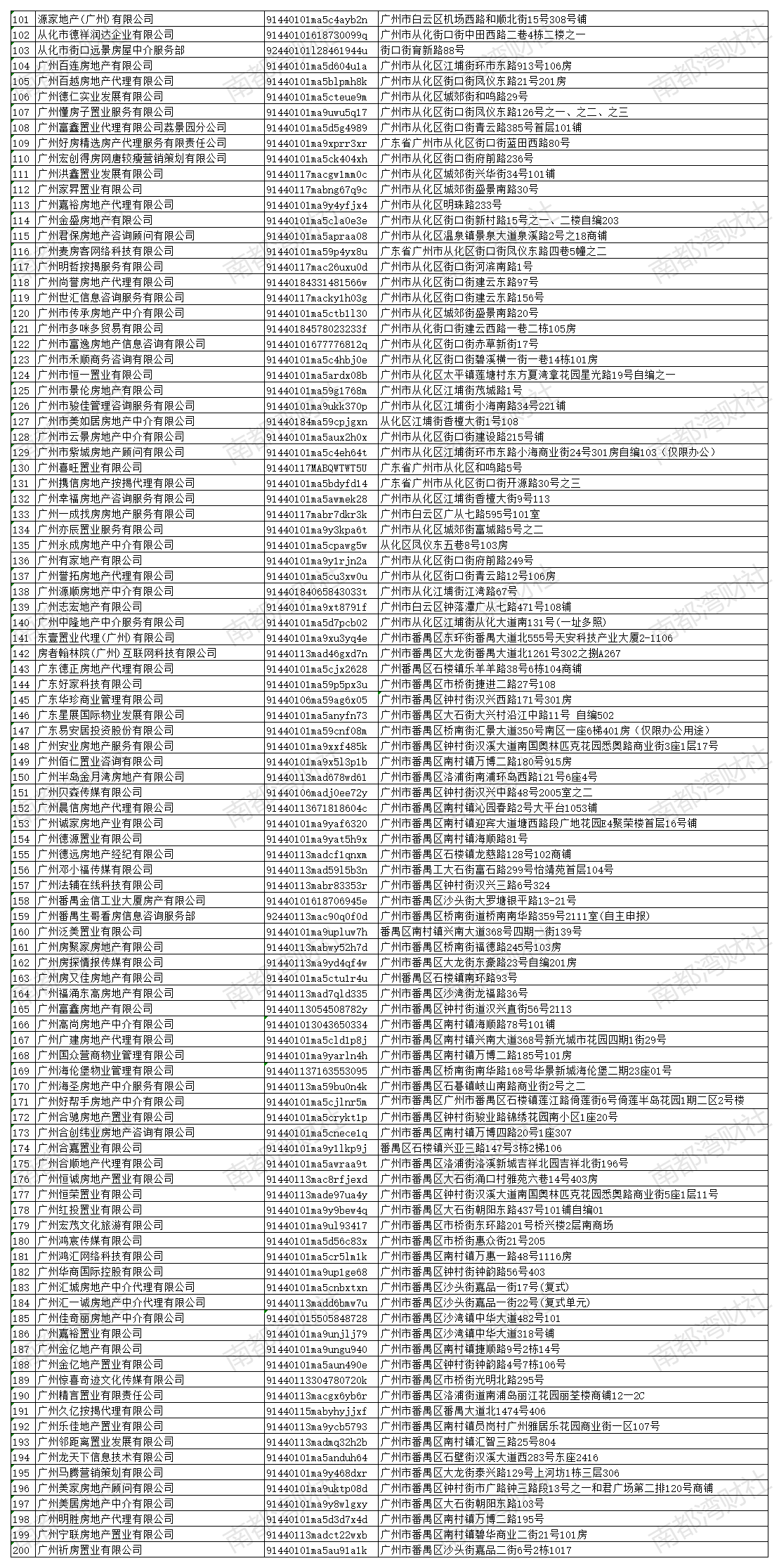 从名单可见,未通过检查的972家房地产中介服务总机构中,有广州海伦堡物业管理有限公司、广州房博士网络股份有限公司、广州乐居找房房地产业有限公司、广州路劲物业服务有限公司、广州融度按揭服务有限公司、广州市星河房地产代理有限公司、广州信承按揭服务有限公司、广州颐德地产有限公司、广州优家好房房地产顾问有限公司、广州粤众安家置业有限责任公司、广州中达房地产代理有限公司、广州仲联信息服务有限公司、寰图(广州)企业服务有限公司、广州市易居置业代理有限公司等,含括了房地产中介、物业管理、按揭公司、共享办公及开发商在楼盘所设的地产中介门店等。