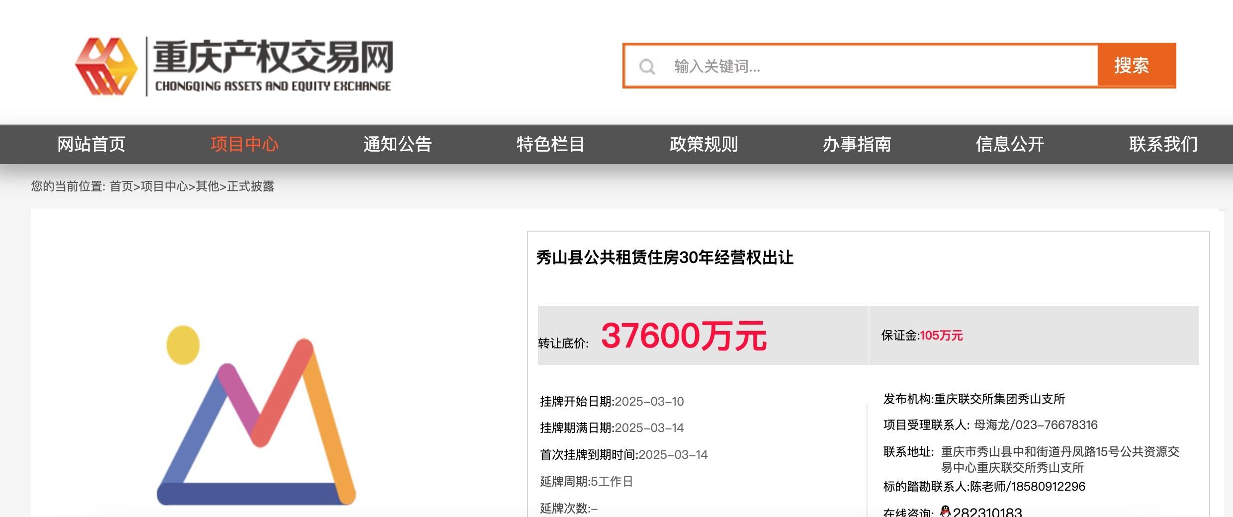 近日,重庆联合产权交易所发布了秀山县、永川区等地公共租赁住房30年经营权出让公告,转让方均为当地住房保障管理中心。
