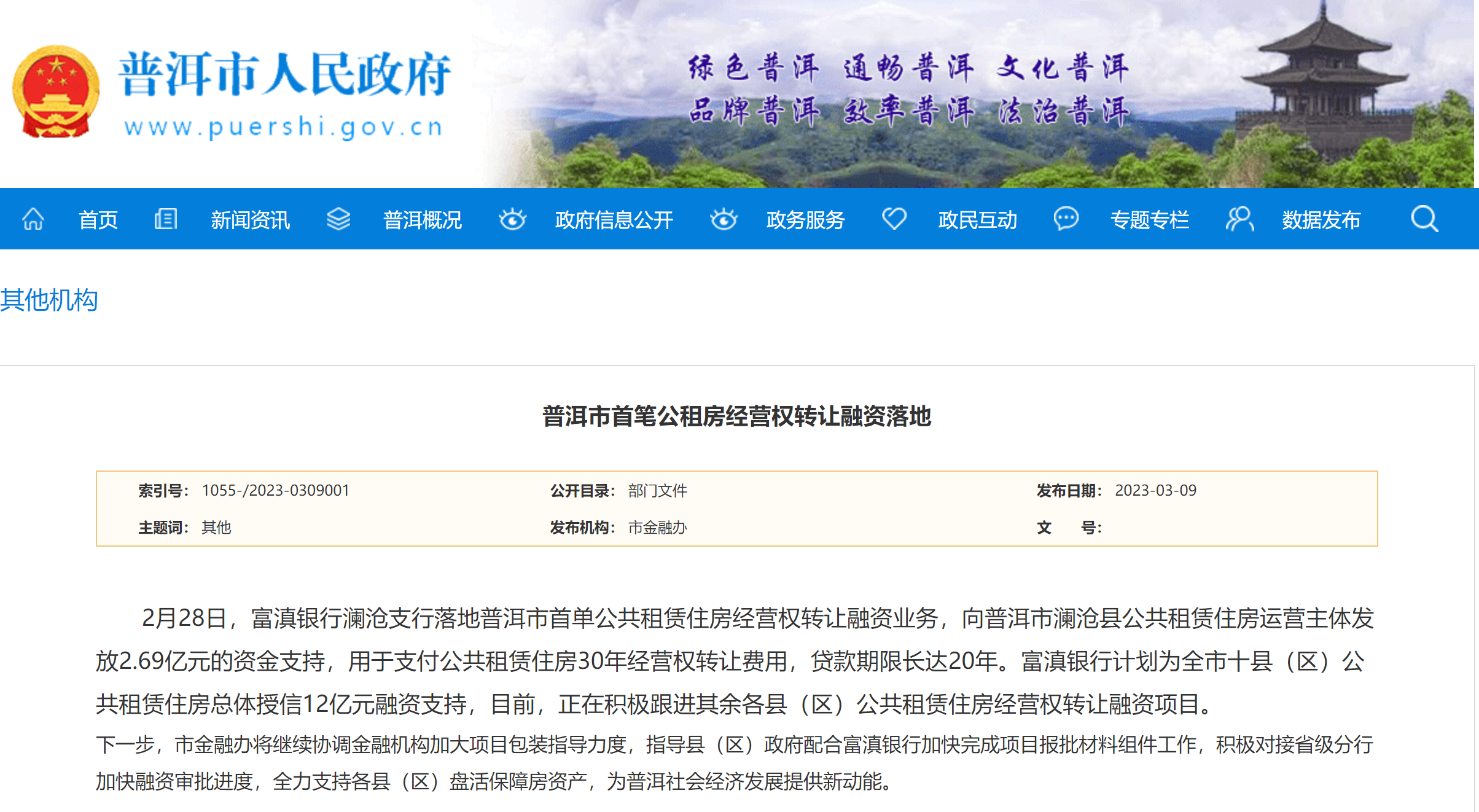 此外,据云南省普洱市金融办披露,2023年2月28日,富滇银行澜沧支行落地普洱市首单公共租赁住房经营权转让融资业务,向普洱市澜沧县公共租赁住房运营主体发放2.69亿元资金支持,用于支付公共租赁住房30年经营权转让费用,贷款期限长达20年。