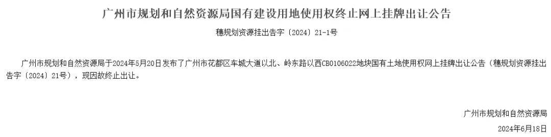 另一宗拟同日出让的花都区车城大道以北、岭东路以西CB0106022地块则提前终止出让。