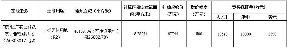 再看花都区广花公路以东、雅瑶路以北 CA0303017地块,宗地面积43169.84㎡,计容建面75271㎡,起拍总价67744万元。
