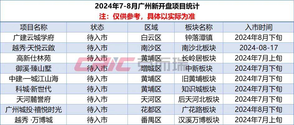 作为楼市传统淡季,据克而瑞不完全统计,2024年7-8月广州预计有9个全新盘入市,主要以外围区项目为主,中心四区仅有1个项目,其中黄埔区入市项目数量最多,共有3个。