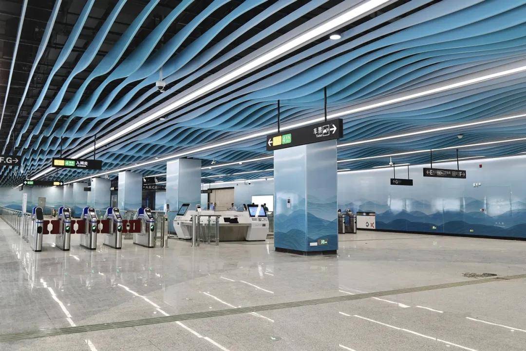 据悉,3号线东延段线路以“流光溢彩”为设计理念,通过加入水、光、浪花等抽象的设计元素让车站呈现出波光粼粼的视觉效果。
