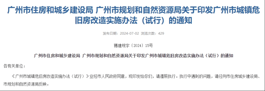 为推进城市更新落地实施,打造宜居、韧性、智慧城市,广州市日前印发《广州市城镇危旧房改造实施办法(试行)》,明确了政策的适用范围、危旧房改造基本原则、危旧房改造的基本模式、危旧房改造的基本要求、改造资金筹措的内容、危旧房改造可享受的政策支持措施等。