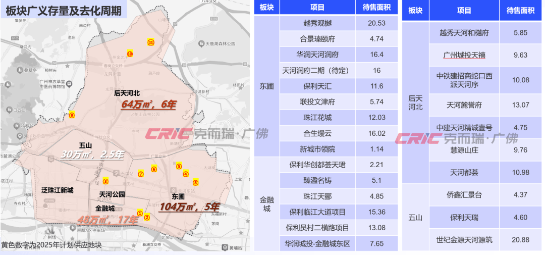 2025年东圃板块计划供应地块基本位于天河智谷内,目前智谷内部在售项目主要集中在东部牛奶厂片区,以大面积改善产品为主。刚需刚改产品主要位于吉山片区。