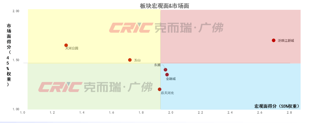 除了规划与产业发展外,板块区位、人口、配套等对板块价值同样起着决定性作用,结合板块基本面以及市场量价、存量去化压力等市场面各项指标综合评分,板块价值排序如下:泛珠江新城>金融城>天河公园>五山>东圃>后天河北。